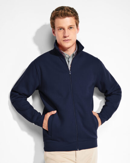 Chaqueta de punto felpado con capucha. Cremalleras inyectadas con tiradores de diseño, cremallera central con protector de barbilla, y una segunda cremallera decorativa en cuello para facilitar apertura. Cuello alto con ajustadores de diseño y cubrecosturas interior. Dos bolsillos frontales con cremallera. Bajo trasero más largo que el delantero, con ajustadores de diseño.