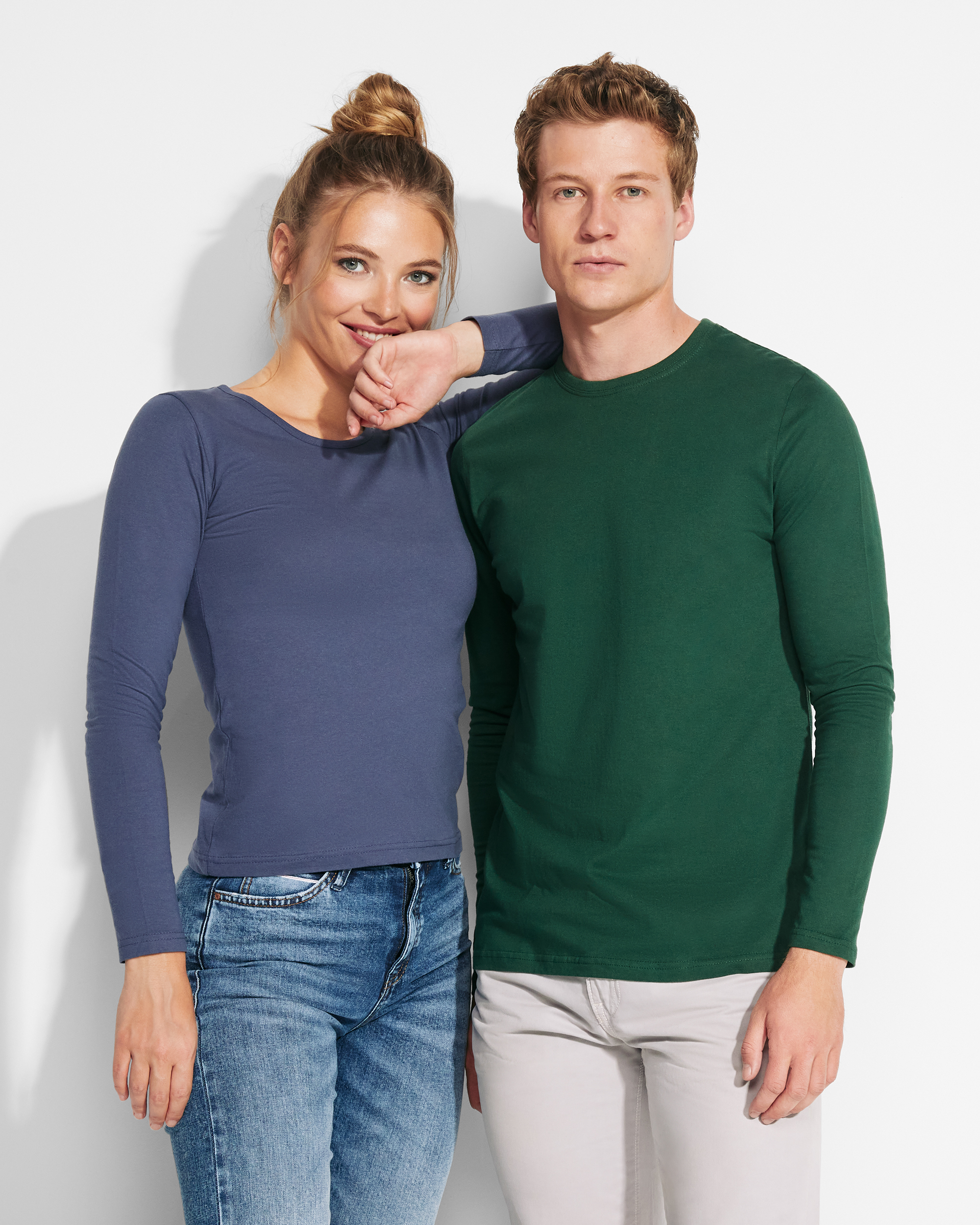 Camiseta de manga larga, tejido tubular y cuello redondo de 4 capas. Cubrecosturas de refuerzo en cuello y hombro. Sin