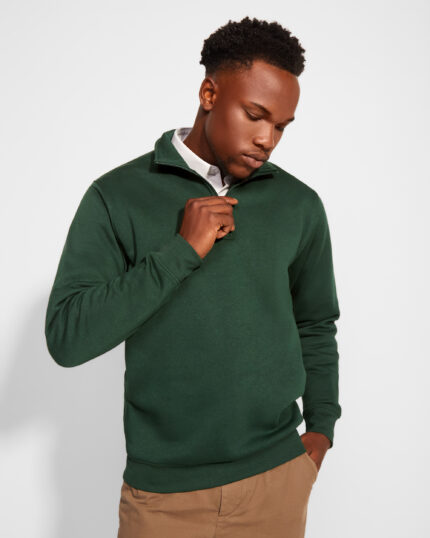 Sudadera con media cremallera a tono y cuello alto. Vista interior del cuello en el mismo tono. Cubrecosturas reforzado en