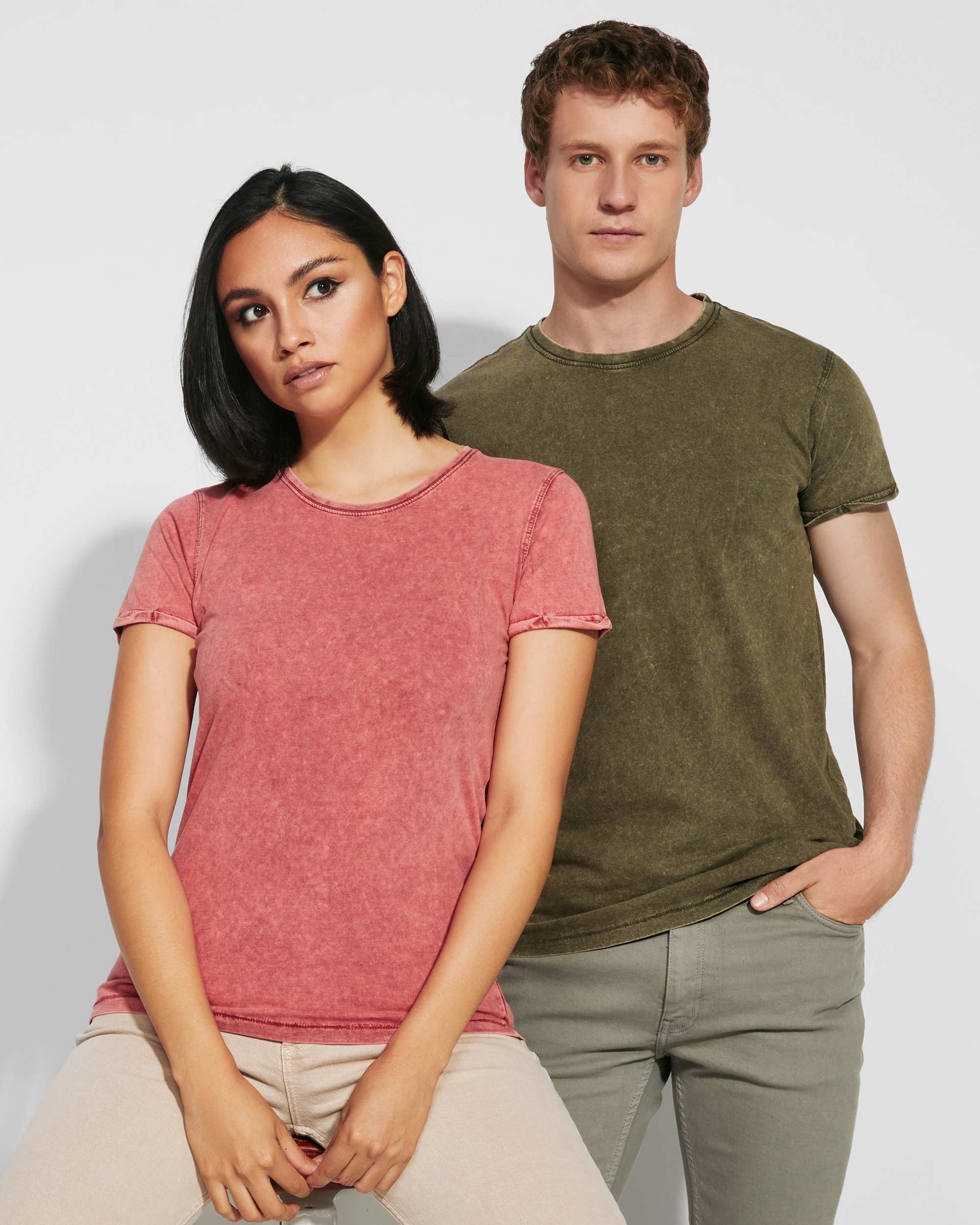 Camiseta de manga corta efecto jeans. Cuello redondo en canalé 1×1, con cubrecosturas de refuerzo interior de hombro a hombro. Doble costura en sisas. Apertura de manga con dobladillo.