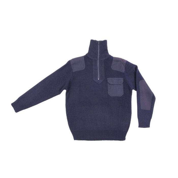 Jersey unisex , cuello alto, media cremallera, refuerzos en codos y hombros, bolsillo de pecho con tapeta. Composición: 100% acrílico