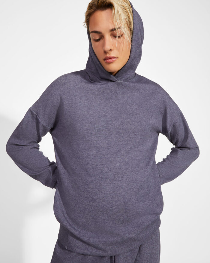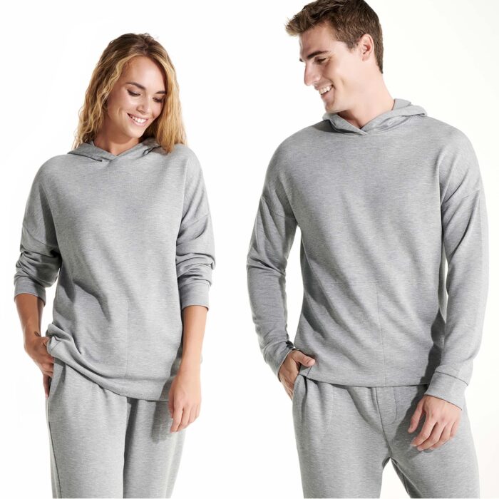 Sudadera con capucha unisex. Bolsillo canguro. Cordones planos con ojales bordados. Puños y cintura en tejido principal. Detalle de costura