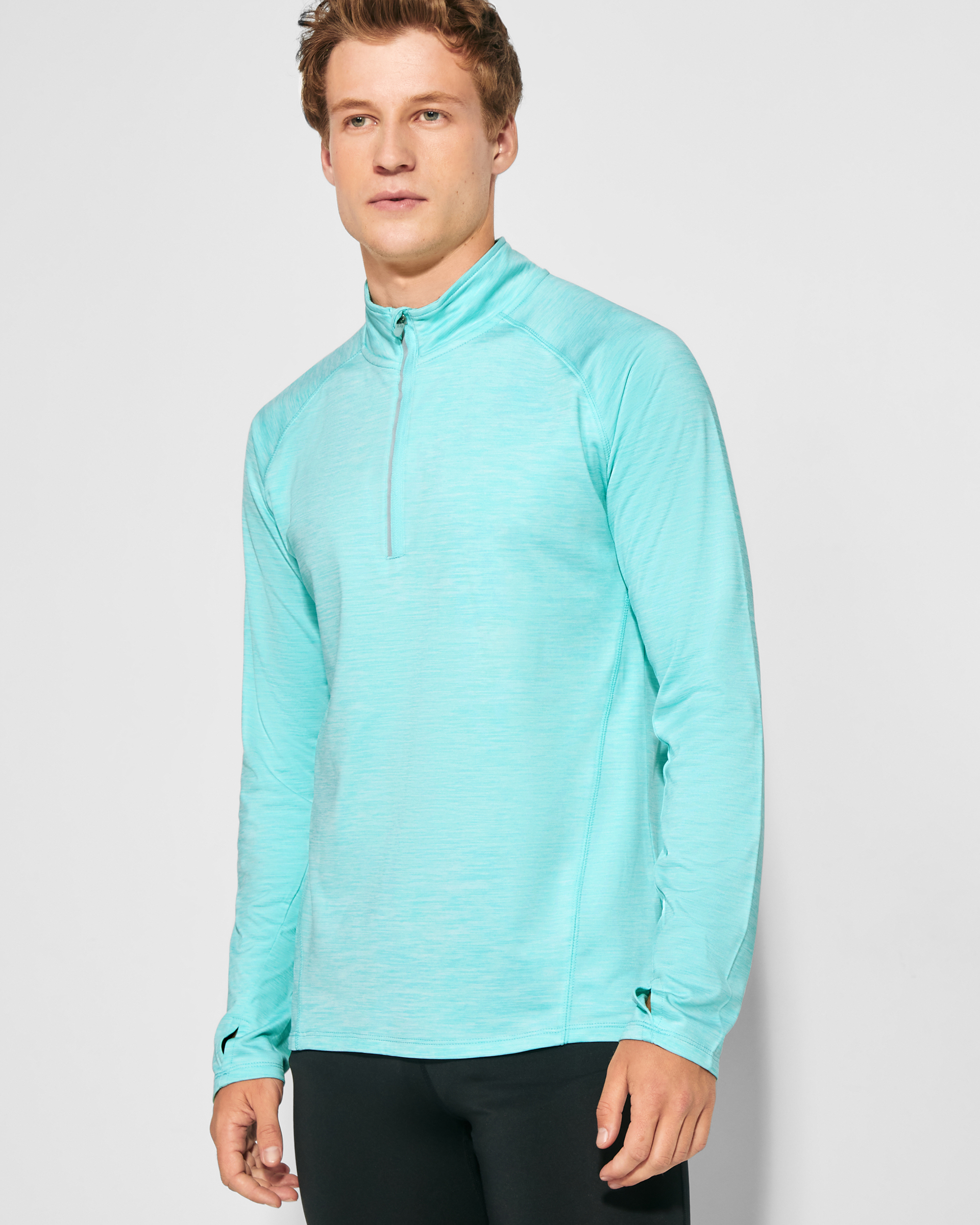 Sudadera técnica de manga larga ranglán para hombre con interior perchado. Cubrecosturas de refuerzo a contraste en el interior del cuello. Media cremallera invertida a tono con detalle reflectante. Puños con apertura para pulgar. El patronaje de la espalda es ligeramente más largo que el delantero. Detalles reflectantes en las espalda.