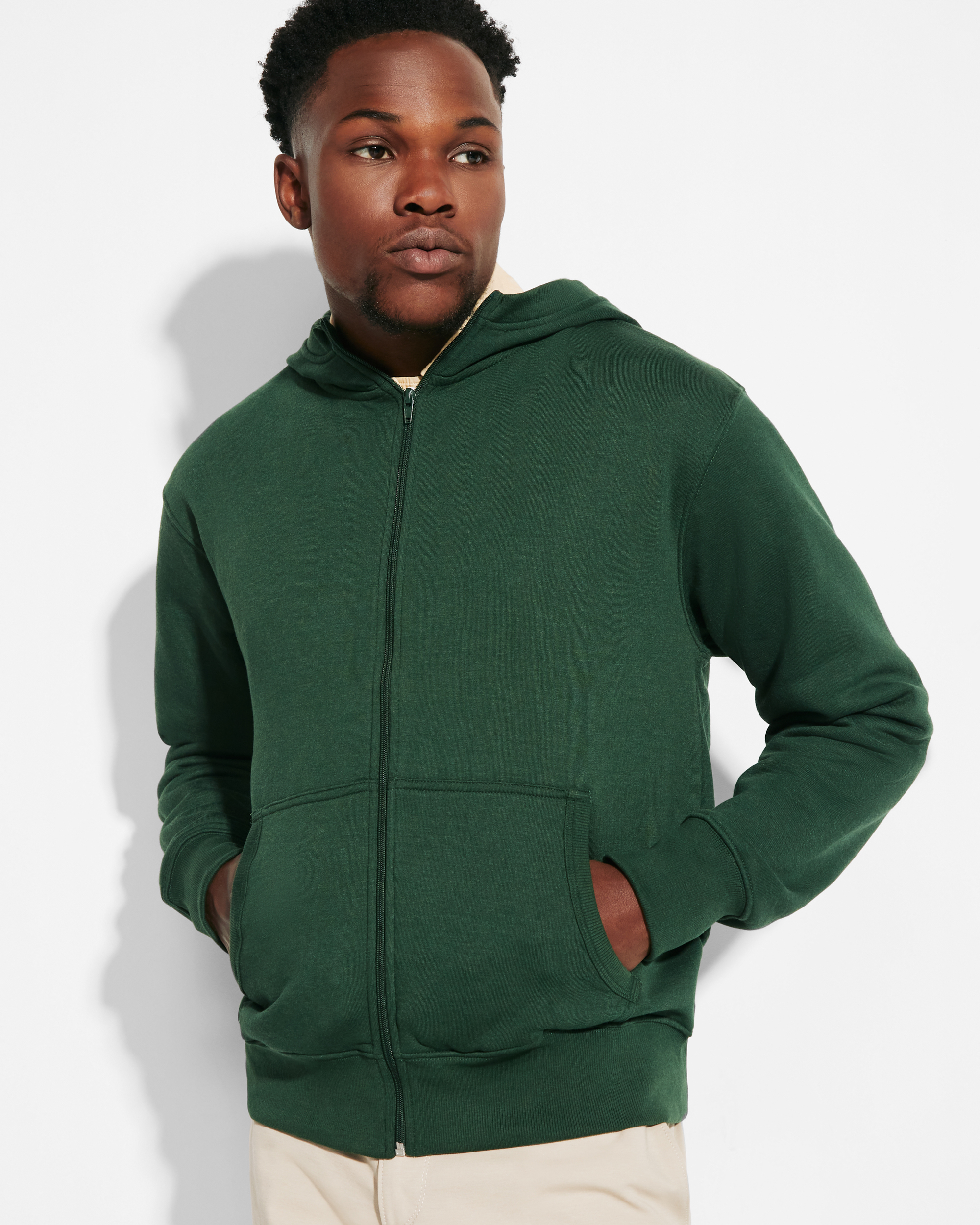Composición: 50% algodón / 50% poliéster, felpa perchada, 280 g/m², 3% elastano en puños.