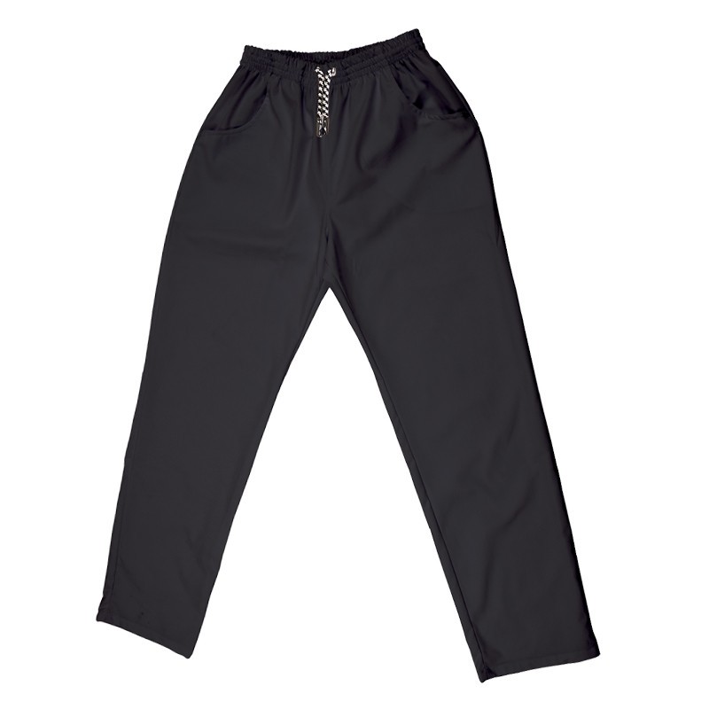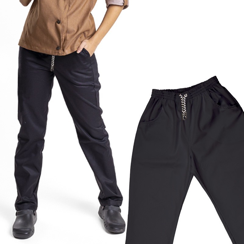 Pantalón cocinero unisex tipo pijama, ajustable en cintura con goma y cordón, dos bolsillos laterales y bolsillo trasero de parche,