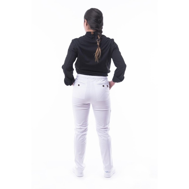 Original chaquetilla de cocina de mujer, de corte entallado y confeccionada en moderno tejido denim elástico muy resistente, duradero y