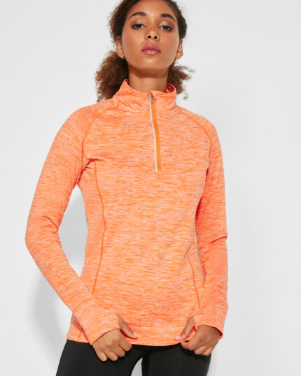 Sudadera técnica de manga larga ranglán para mujer con interior perchado. Cubrecosturas de refuerzo a contraste en el interior del