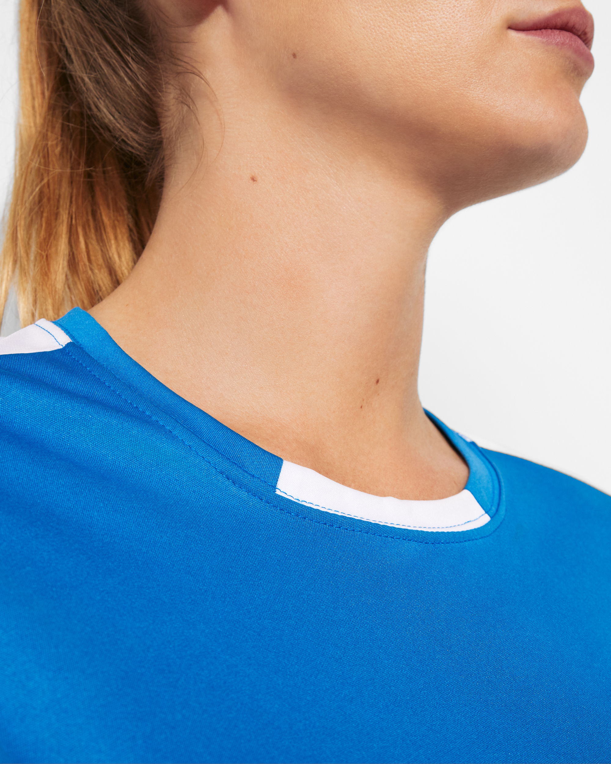·Cuello redondo con ribete bicolor y con cubrecosturas reforzado en su interior.