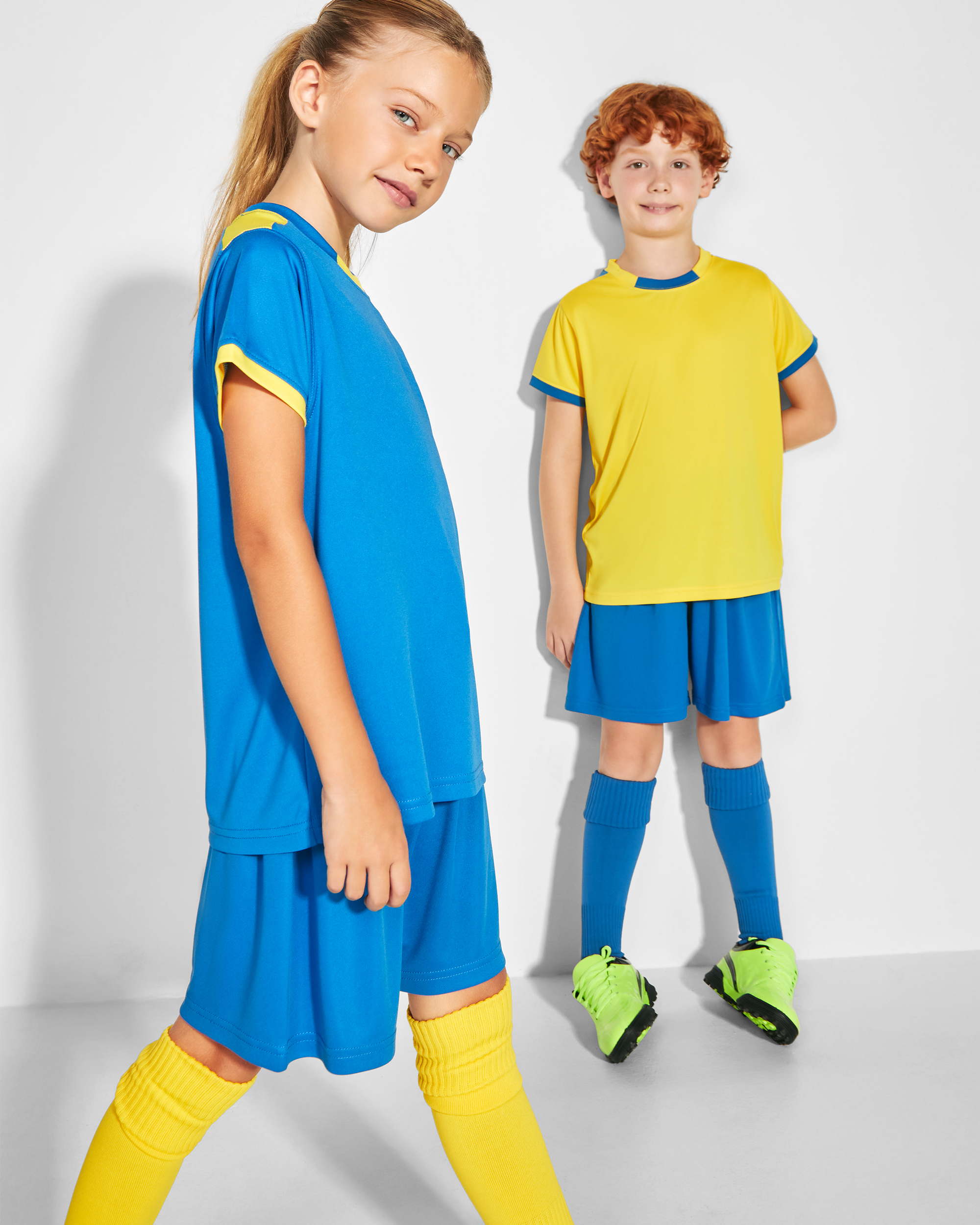 Conjunto deportivo unisex con combinación de tres tejidos: ·Camiseta con cuello mao y apertura mediante broche de presión. ·Interior de