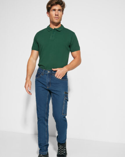 Pantalón vaquero multibolsillos. · Cinturilla con trabillas. · Cierre con cremallera de metal y botón. · Un bolsillo lateral izquierdo