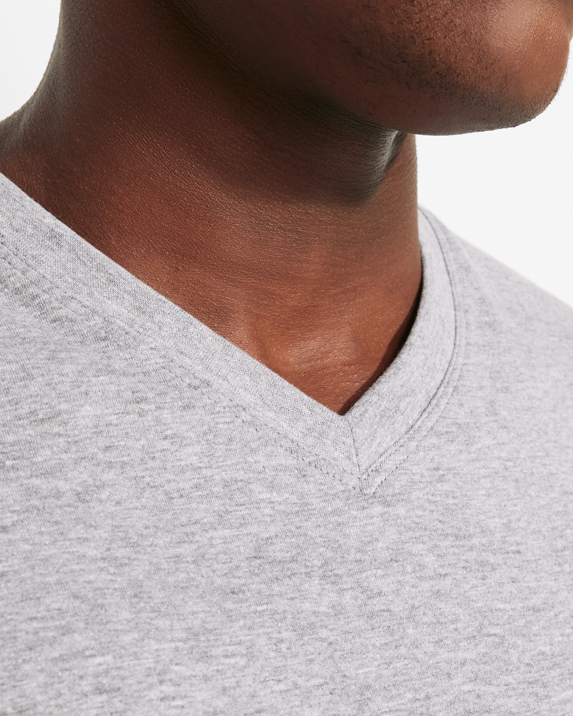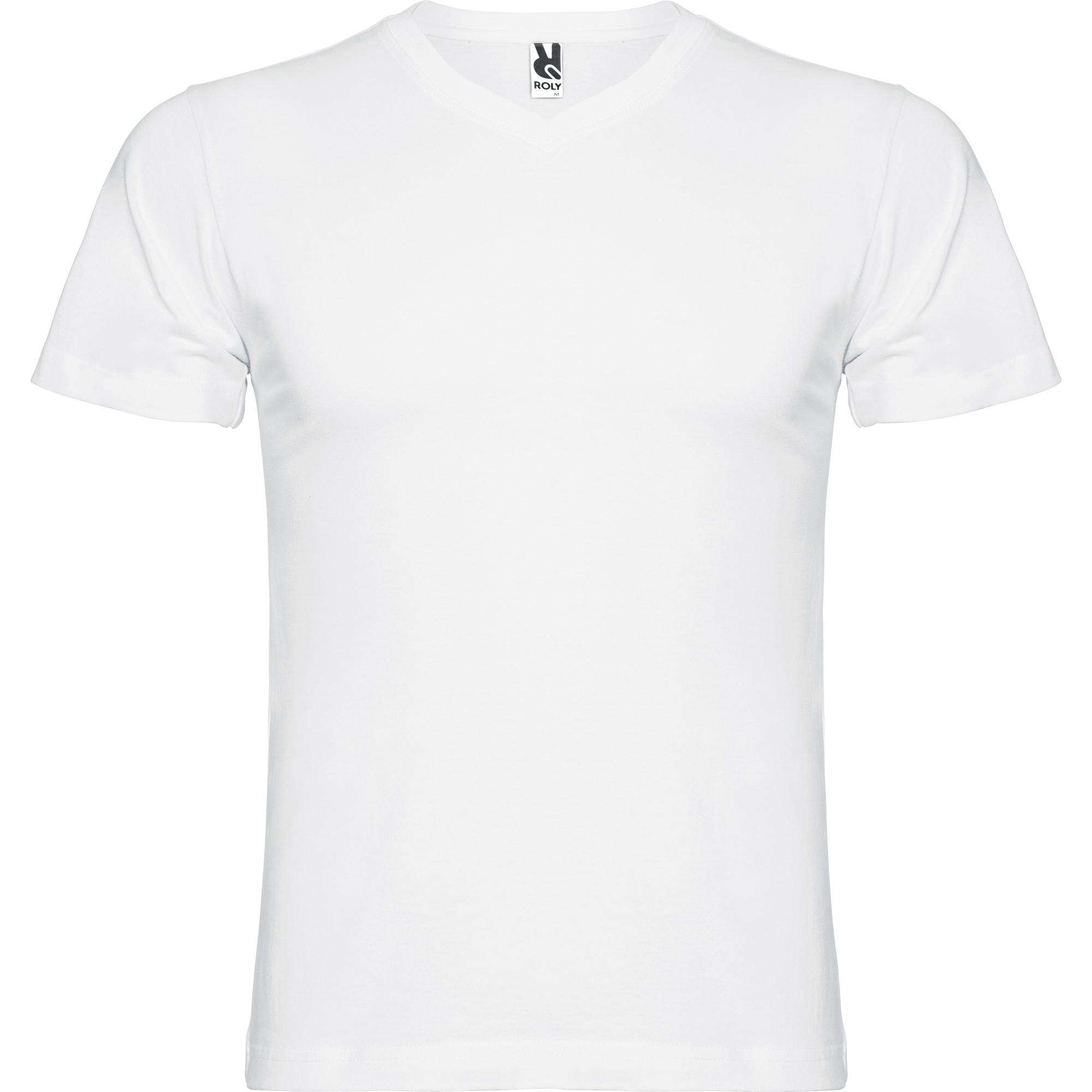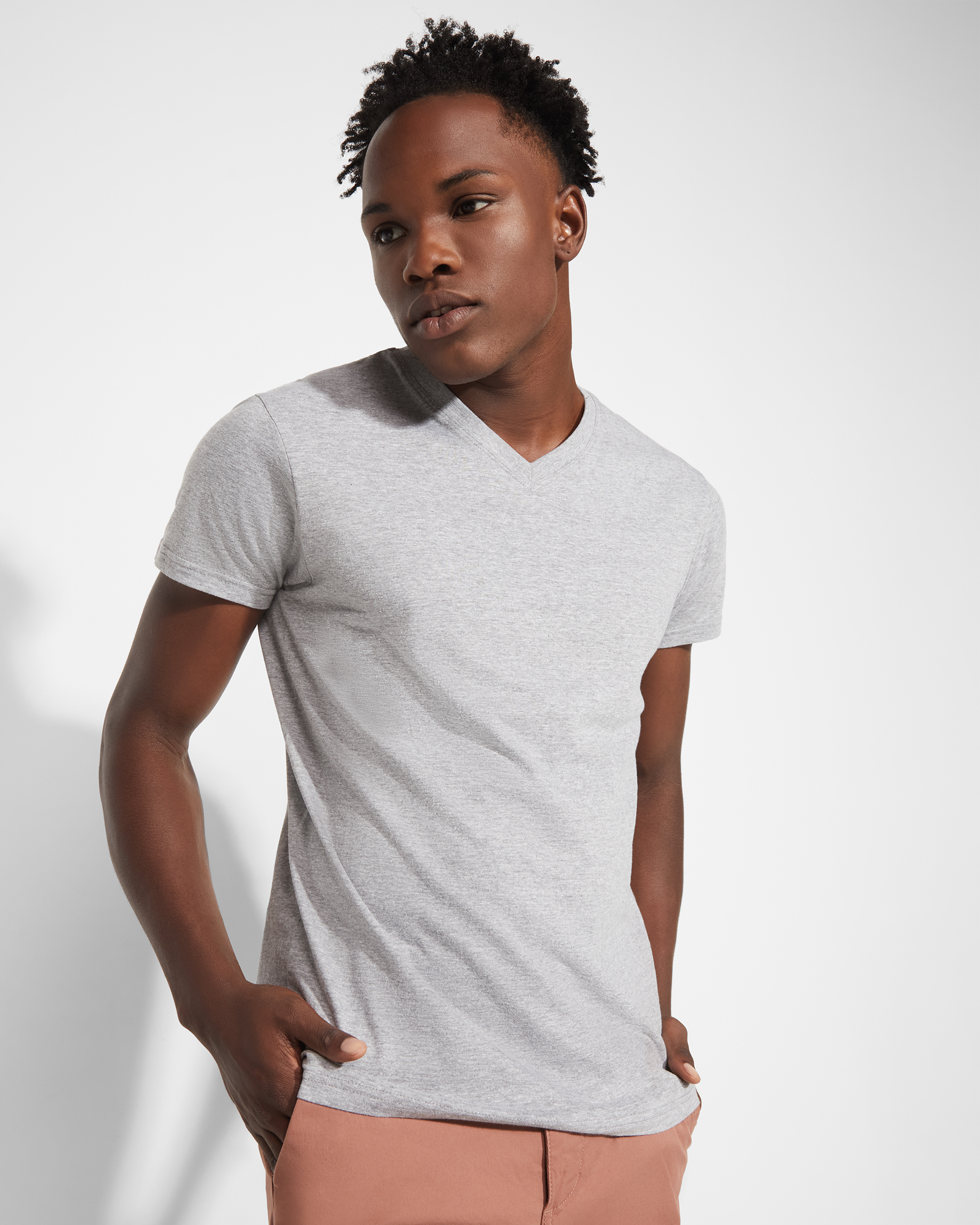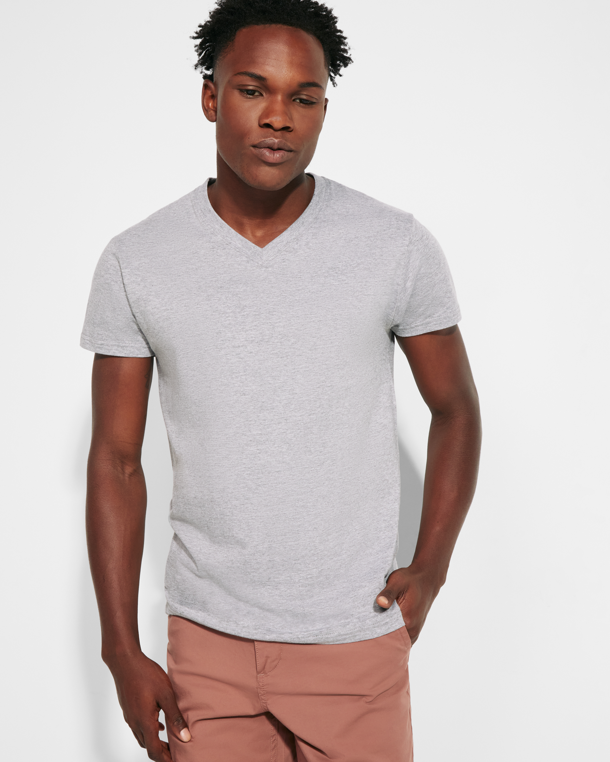 Camiseta de manga corta tubular y escote en pico de 2 capas. Cubrecosturas reforzado en cuello y hombros.