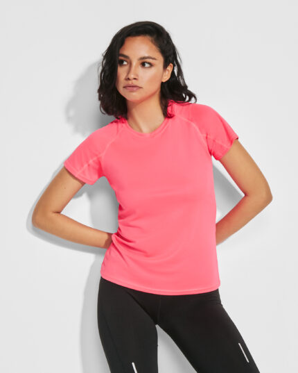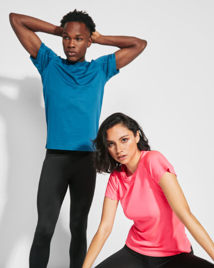 Camiseta técnica en tejido punto liso, de manga corta ranglán, con costuras en contraste en bocamangas, bajo, cuello y laterales. Cuello viveado con el mismo tejido. Tejido transpirable de fácil lavado y secado. Detalles reflectantes, excepto en colores negro y royal, que el detalle es en contraste en color amarillo, no reflectante.
