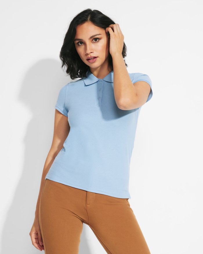 Polo de mujer de manga corta. Cubrecosturas reforzado en el interior del cuello. Cuello y ribete de manga acanalado. Costuras laterales y corte ajustado. Tapeta fina con tres botones. Aperturas en los laterales del bajo.