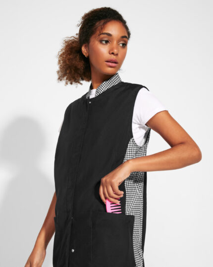 Bata de mujer desmangada. · Cuello mao. · Cierre central con botones automáticos ocultos. · Costadillos laterales y pinzas de