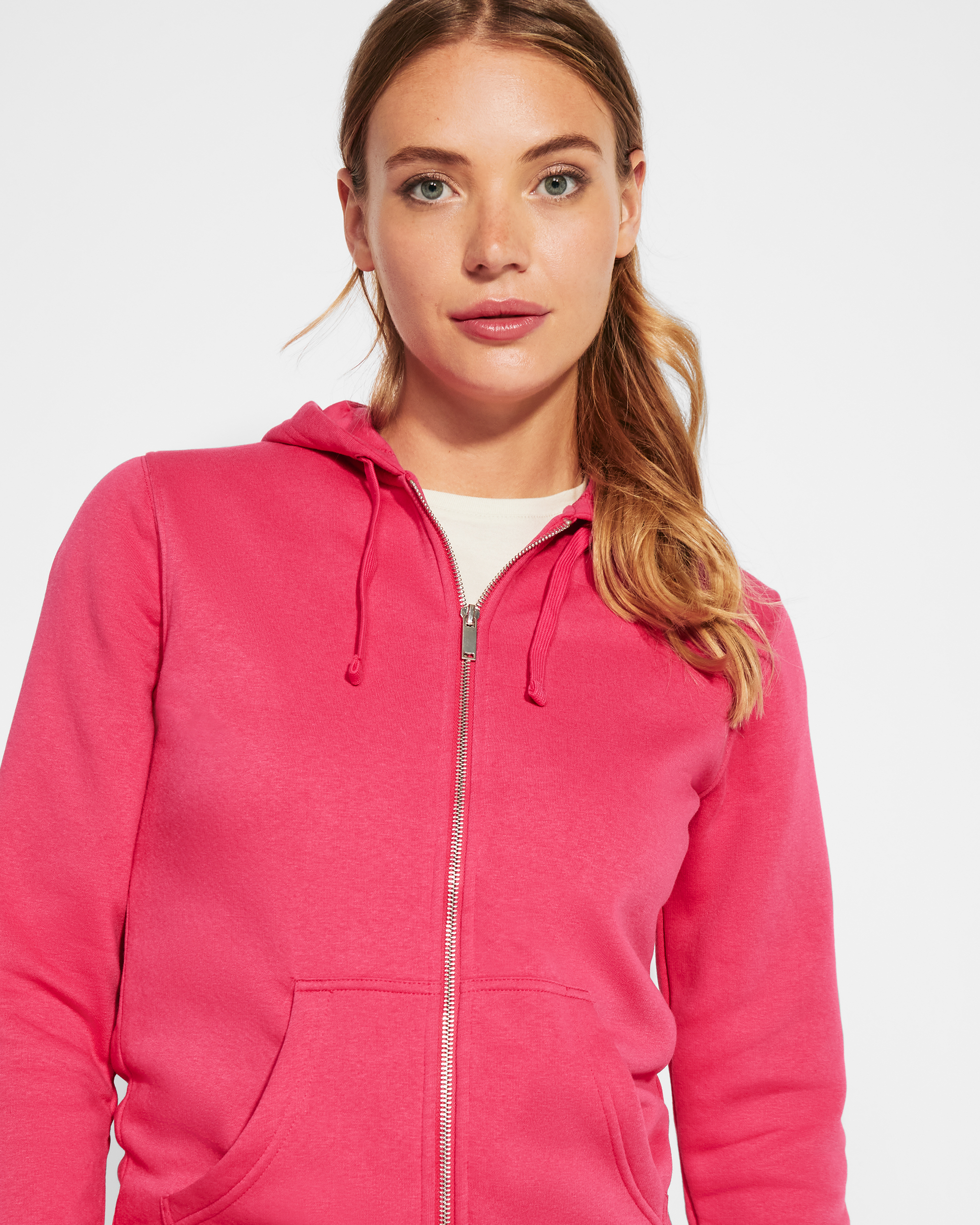 Sudadera de mujer con capucha forrada a tono. Cremallera metálica frontal y bolsillo estilo canguro. Cubrecosturas reforzado en el cuello interior, corte entallado, y punto canalé 2×2 en puños y cintura.